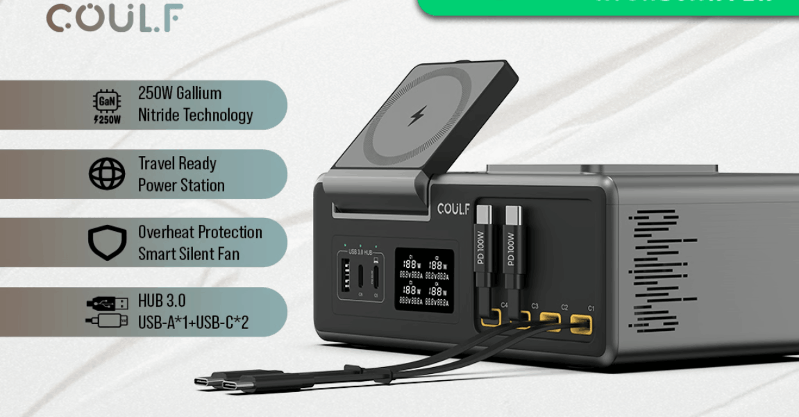 Coulf DeskDock 250W GaN Charger with 4 Retractable Cables